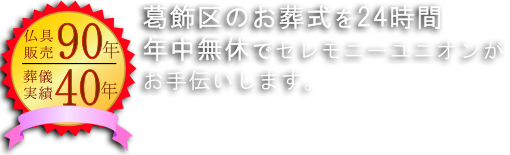セレモニーユニオンは葛飾区で40年間葬儀のお手伝いをさせていただいております。地域に近い葬儀社だからこそ、お客様がお困りの際にすぐに駆けつけることができる迅速性と、葬儀当日は勿論のこと、ご連絡を頂いたその日からアフターフォローまで、きめ細かなフォロー体制が整っております。