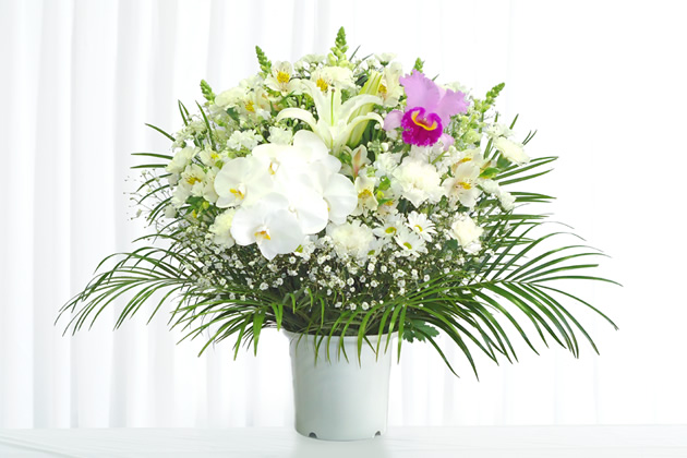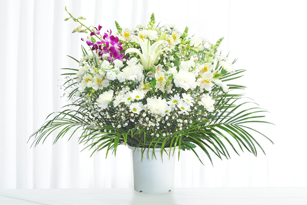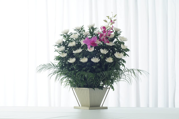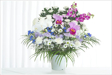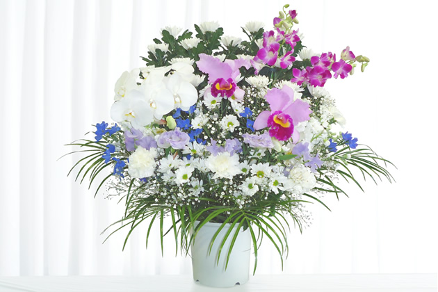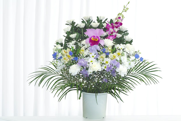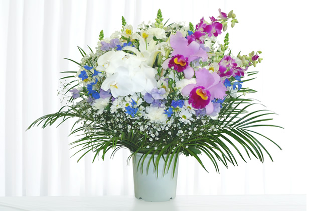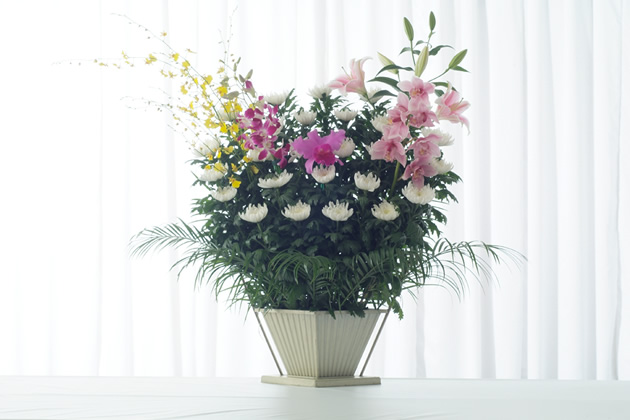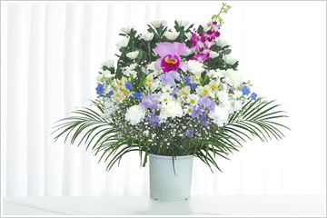 - 色花を豊富に使用した見た目にも鮮やかな供花です。